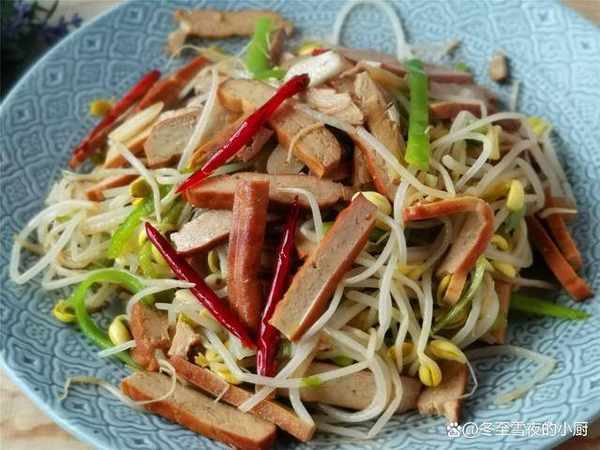 【黃豆芽炒香幹】所需材料:黃豆芽半斤、香幹2片、尖椒2個、油鹽適量、蔥1段、薑2片、大蒜2瓣、幹辣椒4-5個、生抽1湯匙、