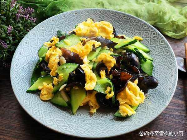 【木耳黃瓜炒雞蛋】所需材料:木耳1把、黃瓜1根、雞蛋3個、油鹽適量、蔥1段、大蒜2瓣、雞精1茶匙、