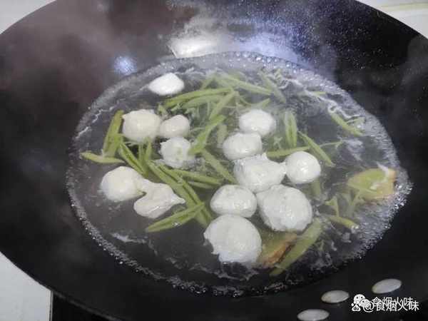 4.這種丸子它是速凍的,所以煮的過程中我們要稍微煮久一點,讓它煮得更熟,更容易出味。鍋裡面的丸子煮好的,就把備好的純菜放入裡面。純菜下鍋後用勺子輕輕地推動,推動好瞭之後再把食鹽跟雞精倒入裡面;