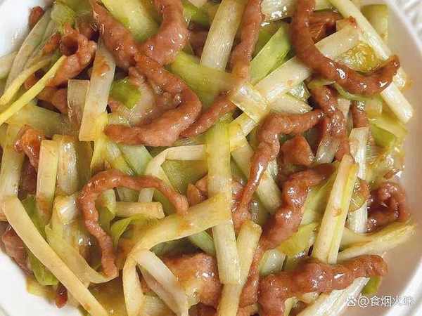 2.鍋裡面倒入油,把油燒熱,油熱瞭之後,我們就把肉絲下鍋,下鍋後用中小火炒,鏟子多翻動,瘦肉炒至微微焦黃之後我們就把備好的韭黃放入裡面。