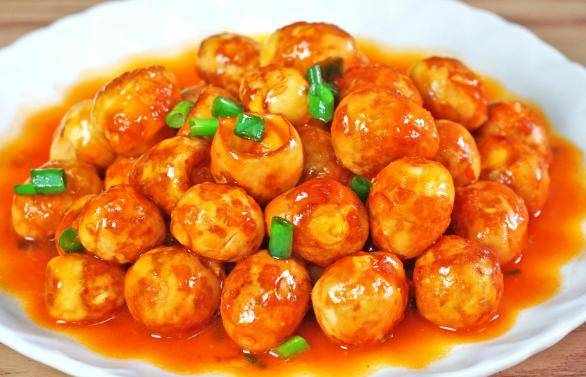 6.邊煮邊攪拌,煮開後把鵪鶉蛋也倒進來,小火繼續煮3分鐘。湯汁快收幹的時候再把淀粉水倒進來勾個芡,翻拌均勻後就可以瞭。出鍋前撒點小蔥花,好吃的糖醋鵪鶉蛋就做好瞭。