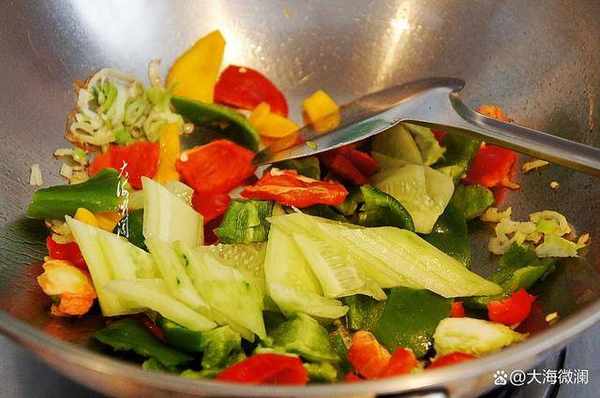 另起油鍋爆香五香粉和蔥花,下入彩椒和黃瓜片翻炒。少許淋點水讓彩椒更滑嫩,顏色更艷麗,口感更爽脆。