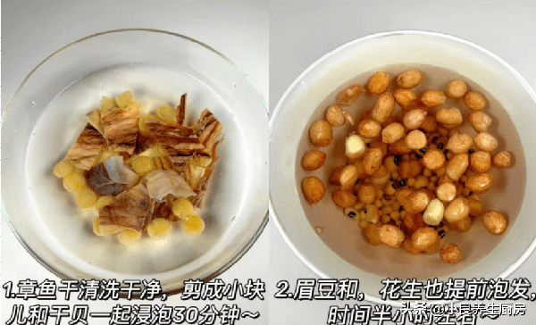 第一步:提前選購好章魚幹,節瓜,花生米和豬骨,先把章魚幹放在容器裡,加上適量食用堿,加上適量溫開水泡幾個小時,撕掉一層黑膜洗凈,或者用熱水焯燙幾分鐘,洗凈切成小塊。