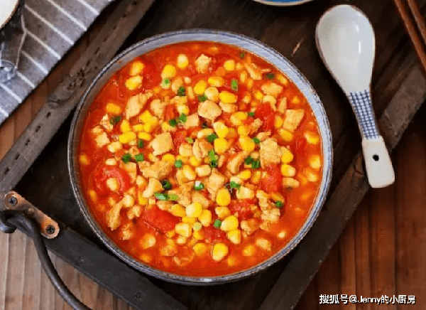 鍋內加油,燒熱後倒入番茄,炒出汁水,再倒入玉米粒翻炒兩分鐘。