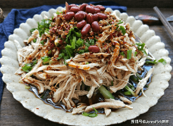 煮好後撈出,放涼後撕成細絲。喜歡吃嫩的,可以換成雞腿,同樣煮熟撕成細絲或者小塊。