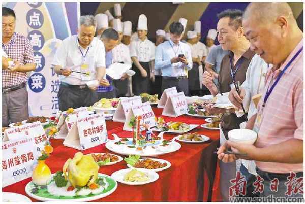 茂名市“10道必點高涼菜”決賽現場,評委進行試菜並點評。