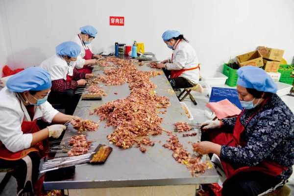 淄博牧羊村燒烤店後廚,串串工從上午8點到晚上8點,一刻不停才能串出2萬串肉串。圖/視覺中國