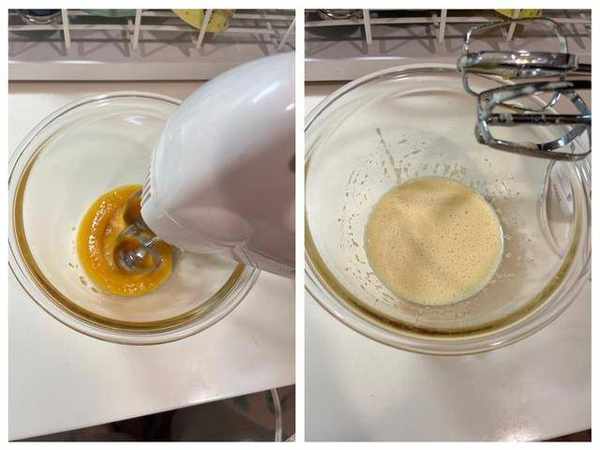 3、可以用打蛋器或是手打大約4-5分鐘會變成偏白色即可不要打太久,將牛奶倒入。