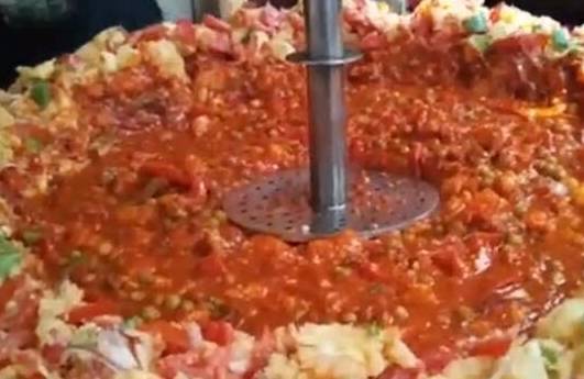 男子在街邊賣這樣的快餐,看得出是什麼地方的美食吧!這就是印度的街邊美食,跟我們這的快餐差不多,首先放入土豆、紅辣椒、蔬菜一起炒。然後把中間的位置留出來,就像和面一樣,中間掏空。