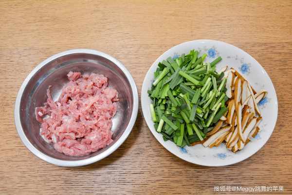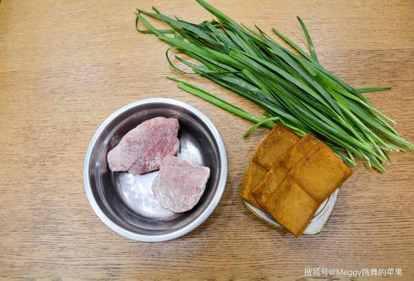 【主料】 豬瘦肉150克,韭菜1把,豆腐幹3片