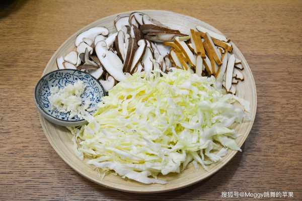 2. 圓白菜切細絲,香菇傘和柄切薄片,豆腐幹切細條,大蒜剁碎;