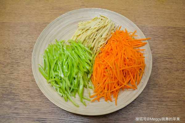 2. 尖椒去籽切細絲;胡蘿卜切細絲或擦絲,豆腐皮切細絲;