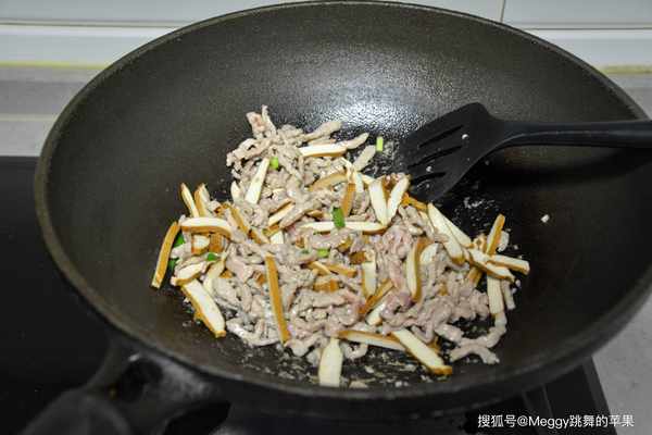 3. 溫鍋溫油,肉絲入鍋迅速劃散;
