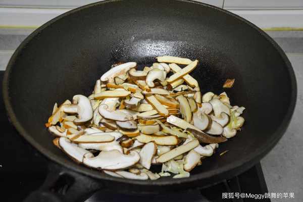 3. 溫鍋溫油,香菇和豆腐幹入鍋,撒鹽,中小火翻炒至香菇變軟;