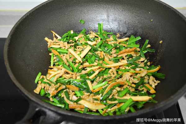 6. 豆腐幹全部變柔軟瞭,放韭菜炒幾下,變色即出鍋,餘溫會讓韭菜進一步成熟。