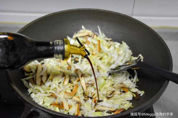 5. 圓白菜吃脆口的,所以炒至微微變軟時倒醬油、蠔油;
