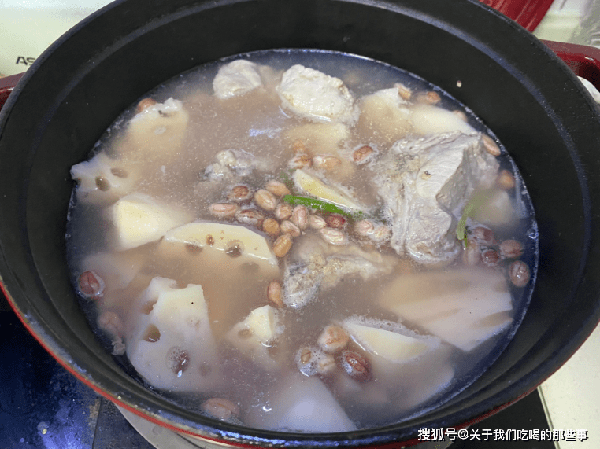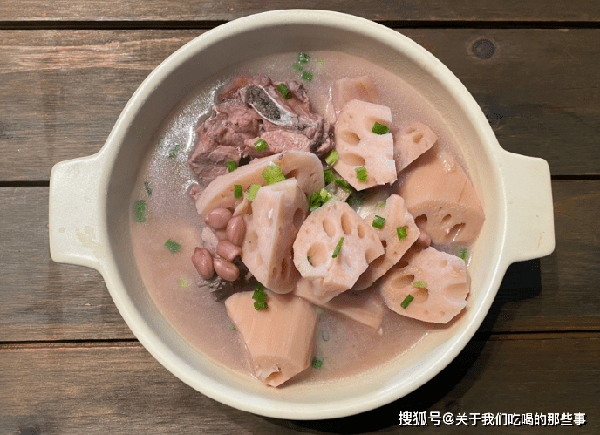 3、放入蓮藕塊,加入食鹽攪拌均勻,繼續燉20分鐘,蓮藕軟爛後即可出鍋,撒上雞精、蔥花即可食用。