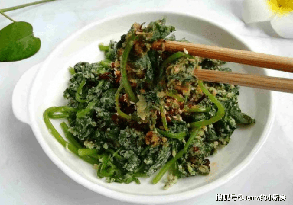 紅薯葉清洗幹凈,瀝幹水分。然後加入鹽、一勺面粉攪拌均勻,再少量分次的加玉米面,加到紅薯葉都裹滿粉為止。