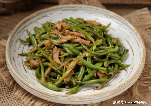 豆角去掉兩頭,清洗幹凈,斜刀切成細絲。豬裡脊沖洗幹凈,切成細絲,加入鹽、生抽、淀粉抓拌均勻,醃制十分鐘。