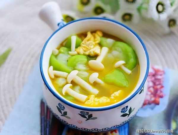 鍋內加油,燒熱後倒入蛋液,炒成小塊盛出。然後不加油,倒入絲瓜、白玉菇翻炒,炒到微微變軟。