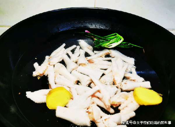 1、雞爪剪掉趾甲,洗幹凈後剁成兩半,生薑切片,香蔥挽成蔥結,蒜瓣切末。鍋裡倒入適量清水,雞爪冷水下鍋,放入薑片、蔥結,放入一勺鹽,倒入一勺料酒,大火煮開。