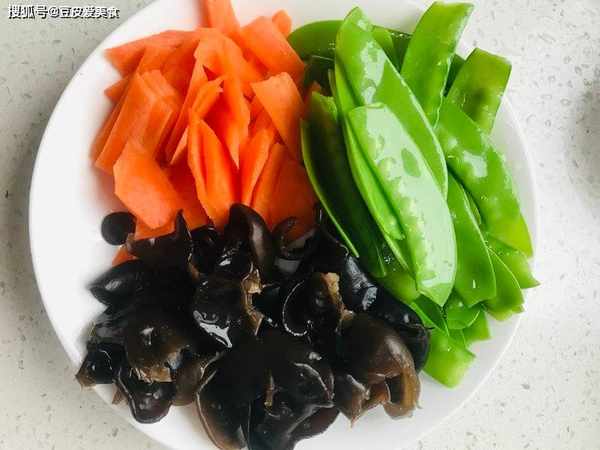 2、荷蘭豆撕掉筋,清洗幹凈。胡蘿卜去皮,洗凈,切片。鍋裡燒開水,下入木耳和荷蘭豆,焯煮片刻,撈出,瀝幹水分。
