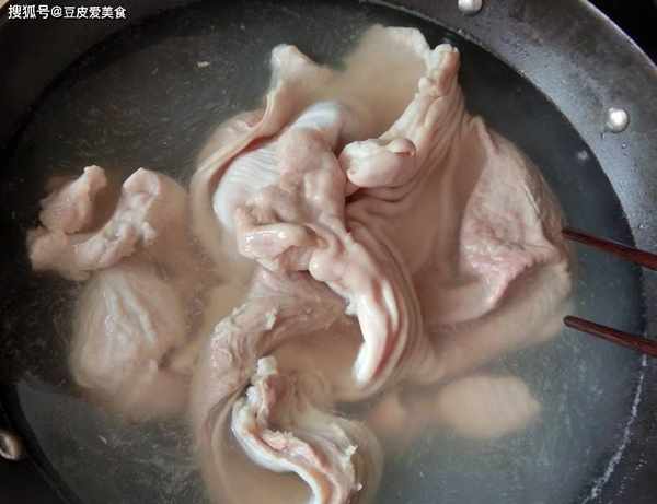 2、豬肚把表面的油摳掉,清洗幹凈。豬肚不好清洗,建議用淀粉、醋、鹽和油反復搓洗幾遍,直到把表面搓洗得粉粉的,沒有粘液,冷水下鍋,加入薑片和料酒,焯煮5分鐘,撈出洗凈,切成條狀,再次沖洗幹凈。