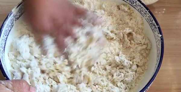 加入高筋面粉,用手和成絮狀,加入15克的食用油,下手揉成面團,把面團移到案板上充分揉勻揉光滑。搓成條,切大小均勻的劑子。把劑子直接按扁搟成橢圓形,放上自己喜歡的餡,花生碎、豆沙餡兒等等。