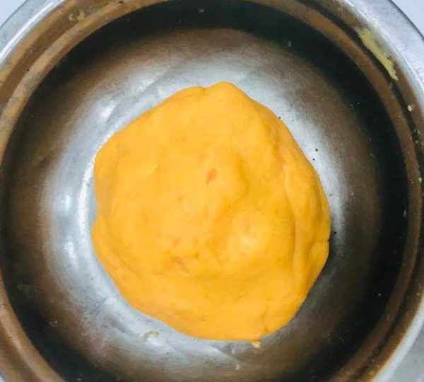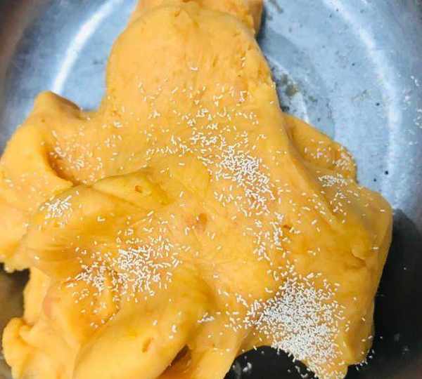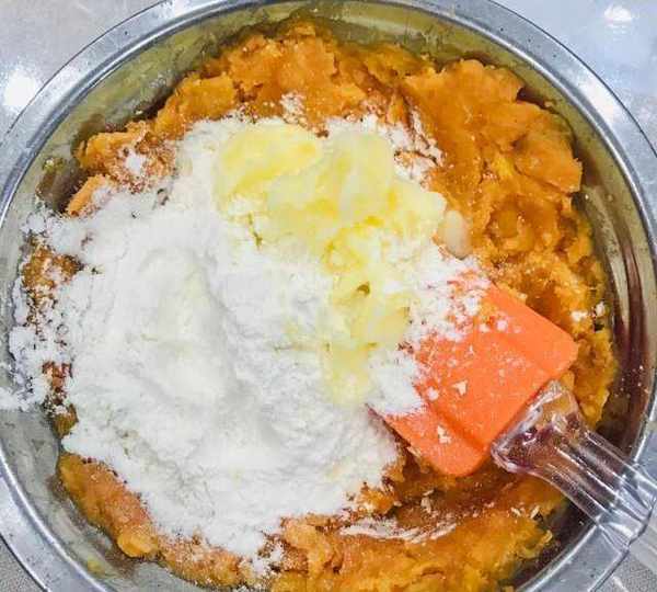 第6步、趁熱把紅薯壓成泥,加入面粉、黃油一起壓成泥狀。