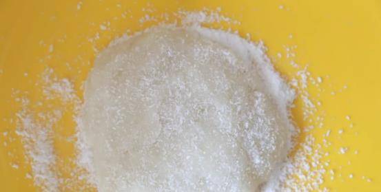 第四步:在案板上撒上一些椰蓉,把糯米團放在案板上,再在糯米團表面撒一些椰蓉,一定要撒的均勻一些。