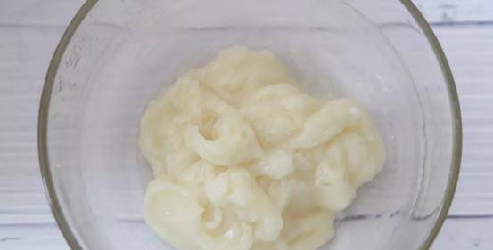 第三步:將糯米糊蒸制到凝固就可以,待其稍微晾涼後用勺子將其舀成團狀。