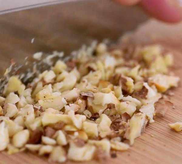 第1步、將核桃放入鍋中,中小火炒3分鐘左右,然後取出切碎。