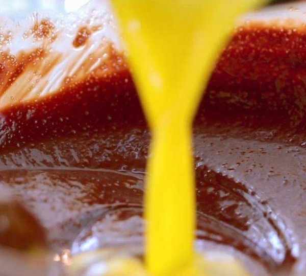 第2步、黃油隔熱水融化,然後加入細砂糖、巧克力,攪拌至融化。