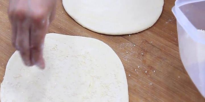 8、將圓餅摁壓成圓劑子,撒少許面粉在園劑子上面,把圓劑子搟成面餅,在面餅上面塗抹上清水,把芝麻均勻的灑在面餅上面。