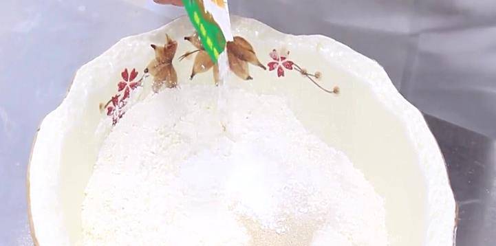 1、首先拿出一個小盆放入500克中筋面粉(也就是我們常說的精制面粉),加入酵母5克,泡打粉3克。