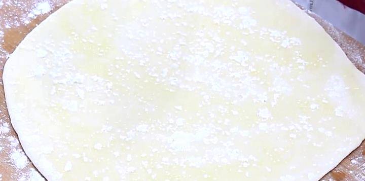 6、均勻塗抹上一層植物油,然後再均勻的撒上一層食鹽,再撒上一層面粉(也可以事先準備一點油酥,直接用刷子刷在上面)。