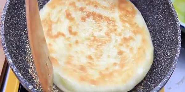 9、把鍋燒熱,在鍋底均勻塗抹一層植物油,放入面餅,晃動平底鍋使面餅均勻受熱,在面餅朝上的一面塗抹一層植物油,會使炕出來的面餅更酥透,多次翻面煎至兩面金黃、熟透、起鍋。
