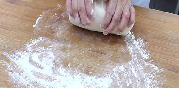 4、案板上撒上面粉,將餳發好的面團放在揉,把面粉揉勻,揉到表面光滑沒有褶皺。