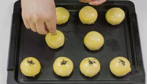 用搟面杖將其搟成牛舌狀,翻面。從上往下卷起來,收尾朝下。再次搟成長條狀,翻面,從上往下卷起來,豎直放起來,按壓下去。用搟面杖搟成圓形,收口朝內,包入準備好的餡料。將蛋黃打入碗中,打散備用。將做好的蛋黃酥胚放到烤盤上面,刷上一層蛋液,撒上黑芝麻。放到烤箱裡面,上下火180度烤25—30分鐘,取出來,放涼,就可以瞭,開始享用瞭。