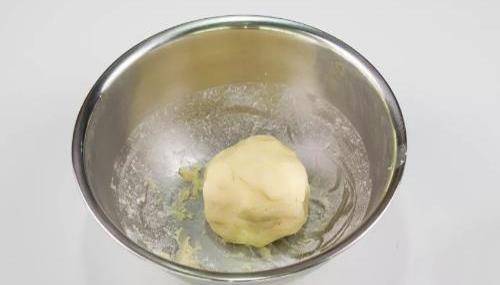 準備一個大盆,放入中筋面粉、低筋面粉、豬油、糖粉、鹽和清水,開始制作油皮。將所有的材料都混合攪拌均勻,一直揉出手套膜。然後蓋上一層保鮮膜,放到一旁醒發松弛30分鐘左右。
