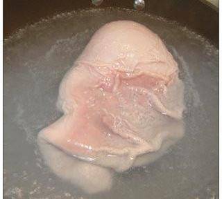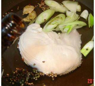 3.焯好水的豬肚取出來,把豬肚上的油和白色硬殼去掉。鍋裡加入幹凈的水,加入料酒、大蔥、薑和花椒,把豬肚放進去,水開後把火關小一些,煮1個半小時左右