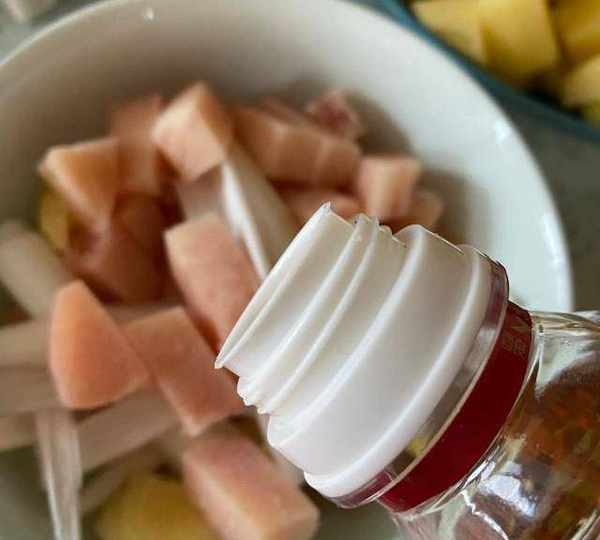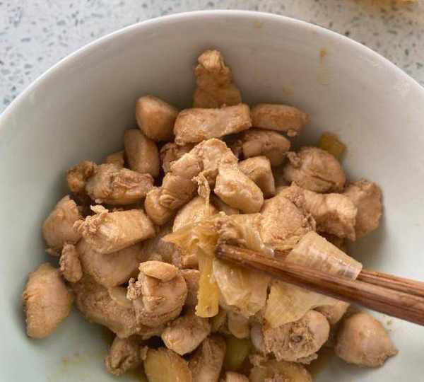 第5步、雞脯肉切丁,放入蔥薑,料酒,一點點生抽,攪拌均勻醃半個小時。