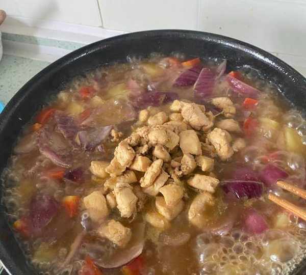 原料:雞脯肉、土豆、胡蘿卜、洋蔥、蔥、料酒、生抽、薑、黑芝麻。
