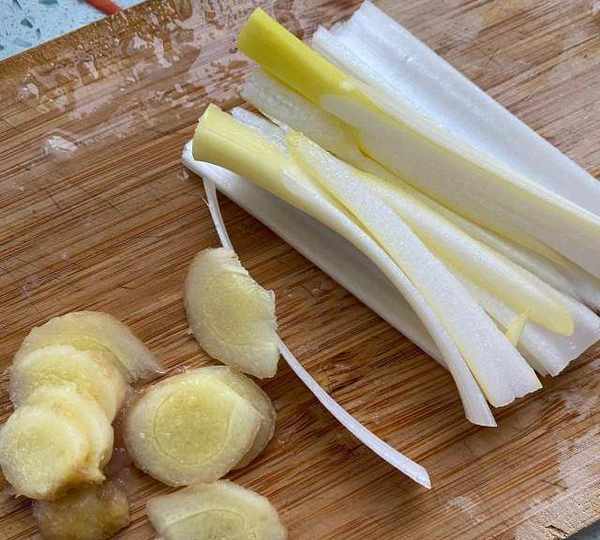 第4步、薑切片,蔥切粗絲。(不要切太小,之後不好挑出來)