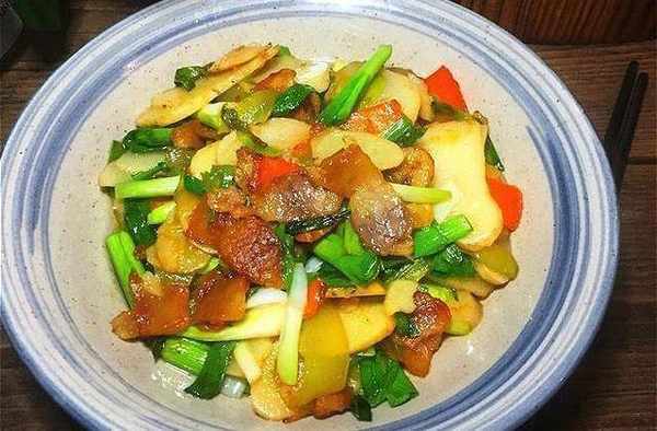 配料:蒜苗,一半培根,一半生菜,一半胡蘿卜,一半山藥,糖,醬油