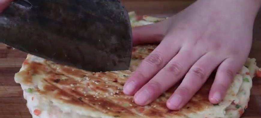 把每個面劑用搟面杖搟成餅皮,刷食用油,然後三層餅皮疊加在一起,邊緣處把它卷起來,撒白芝麻,在電餅鐺中烙5分鐘,時間到翻面再烙5分鐘。5分鐘後關火出鍋,切成小塊。美味的胡蘿卜千層肉餅就做好瞭。吃起來外脆裡軟,營養鮮香。