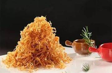 1、切去金針菇的兩頭,加鹽和幹生粉一起拌勻後,投入七成熱的油鍋,炸至色金黃且酥脆時,出鍋瀝油裝盤,隨後撒上肉松。
