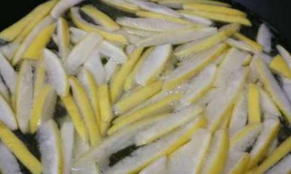 然後我們將柚子皮切成,長條狀之後倒進大盆當中浸泡半個小時左右,這樣可以去掉柚子皮當中的苦味兒。