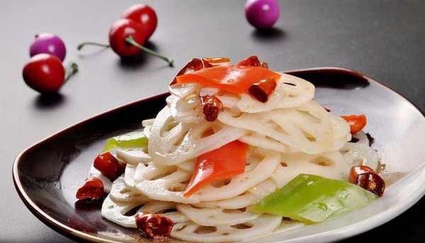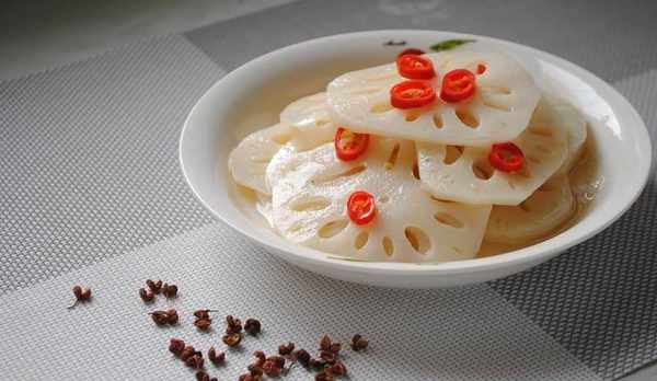 再把藕片加精鹽、醬油、醋、味精拌勻盛入盤內,放上薑末;最後用花椒油熗在藕片上即可。