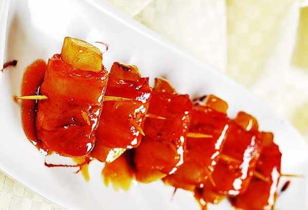 青蘋培根卷,青蘋切成小長塊,把鹽用熱水調開,放入青蘋。培根從中間處切開,一條培根分成兩份,再把青蘋卷起來。小蔥切小蔥花備用。鍋中刷一層薄油,放入培根卷,中火煎培根肉變色至熟。撒入辣椒粉、花椒粉、芝麻、蔥花拌勻即可。愛已經辜負的太多瞭,美食就不能再辜負瞭!